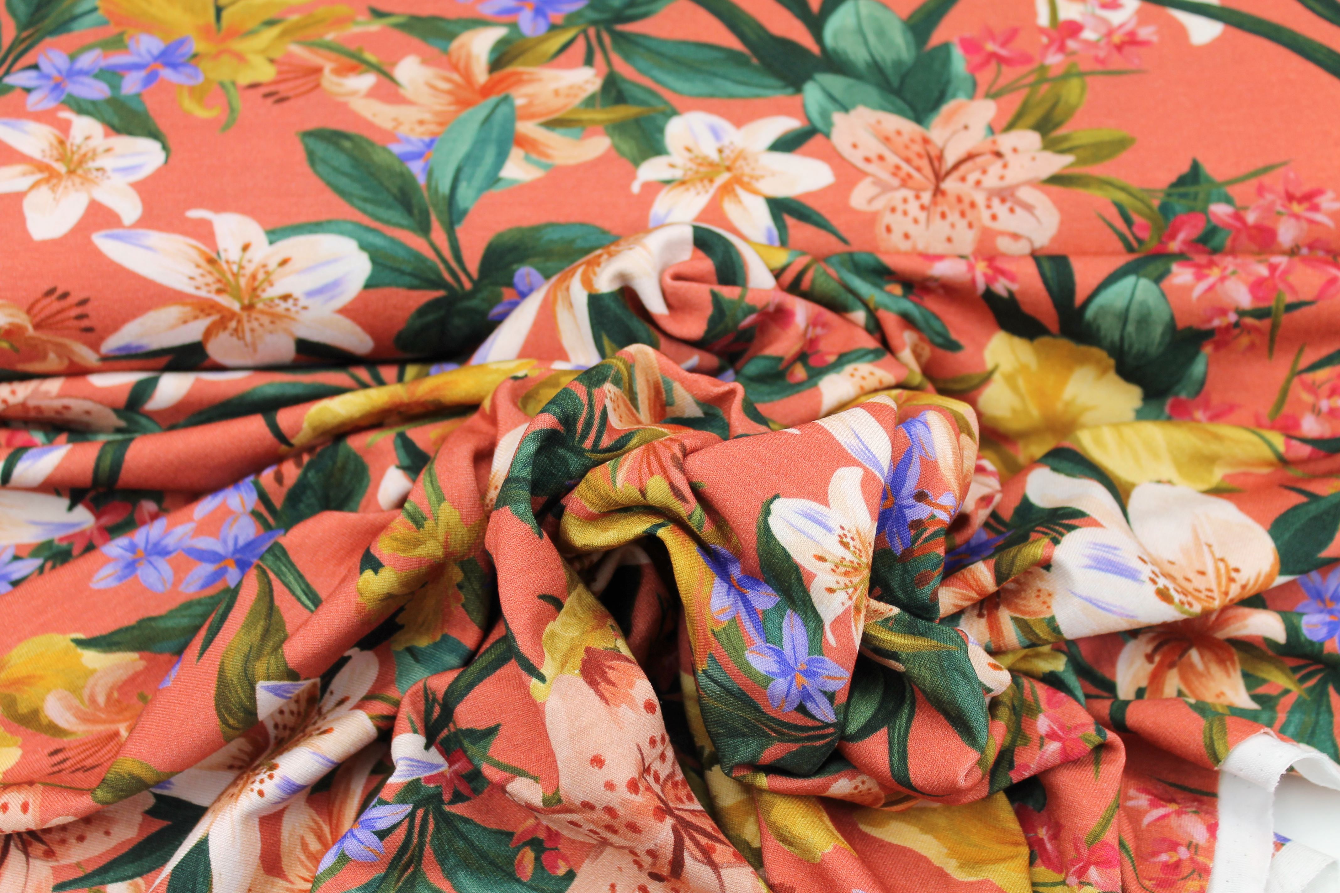 Leicht fallender Viskosejersey in koralle mit Hibiskusblüten in apricot und hellen Farbtönen. Viskosejersey ist dehnbar und eignet sich perfekt für Sommerkleider, Maxikleider, Shirts mit Wasserfallausschnitt oder Fledermausärmeln.