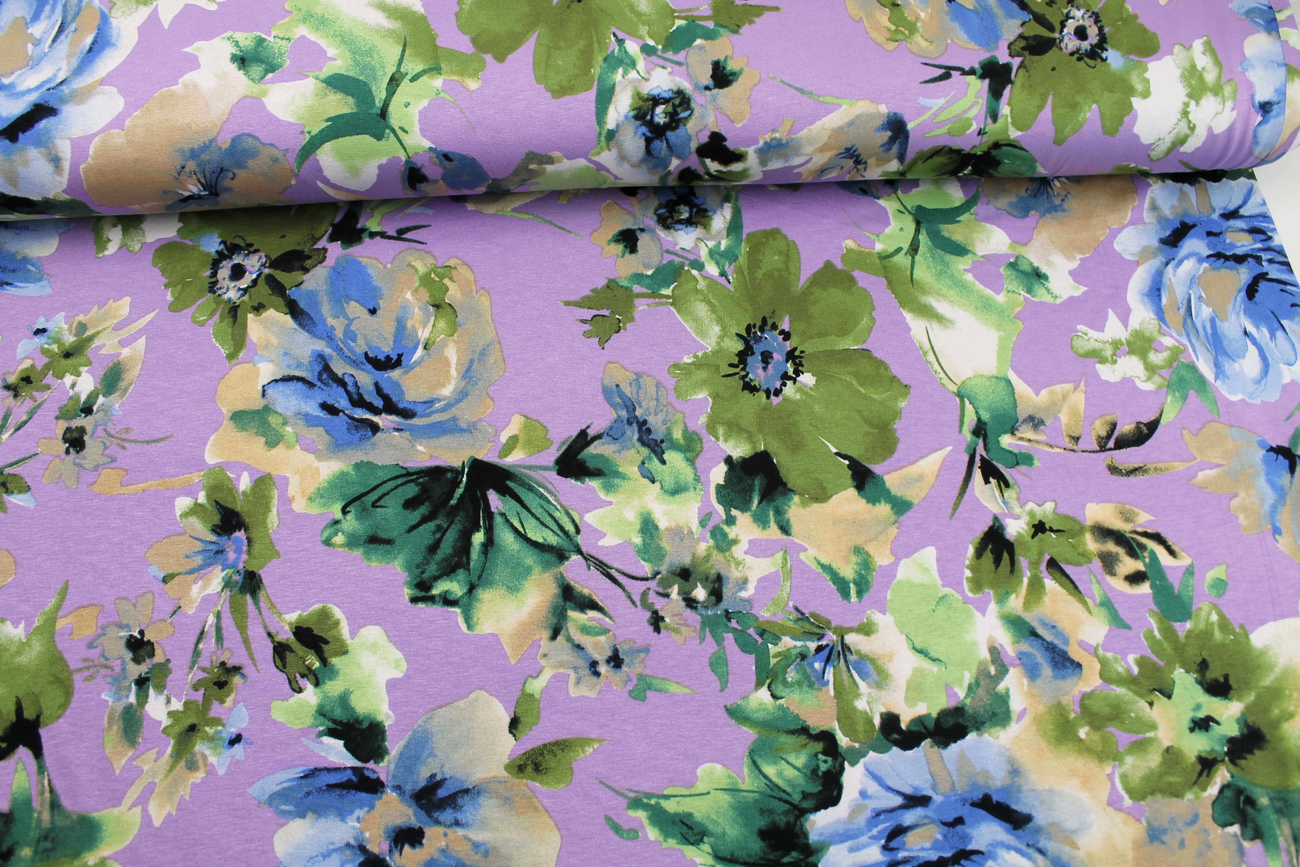 Viskosejersey "große Blumen" lila grün beige blau