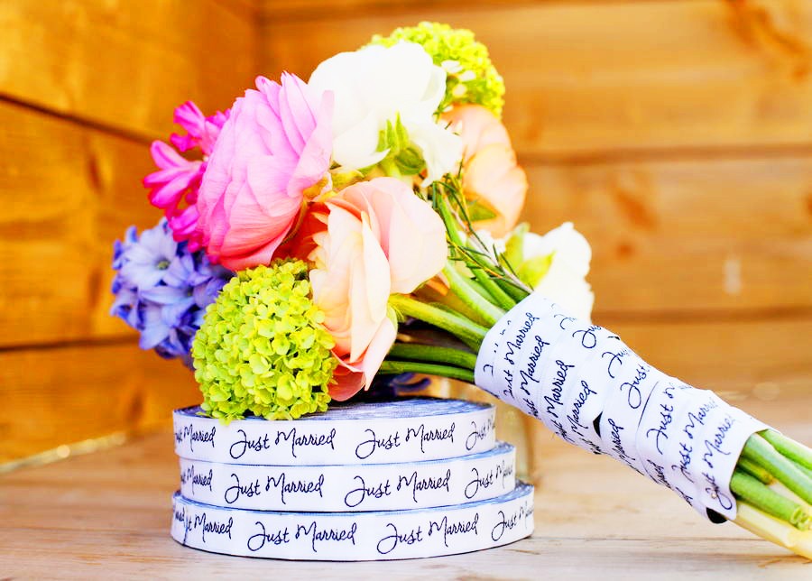 Tolles Webband mit "Just married" Schriftzug. Aus dem Webband kannst du schöne Schlüsselanhänger machen und als Hochzeitsgeschenk verschenken.